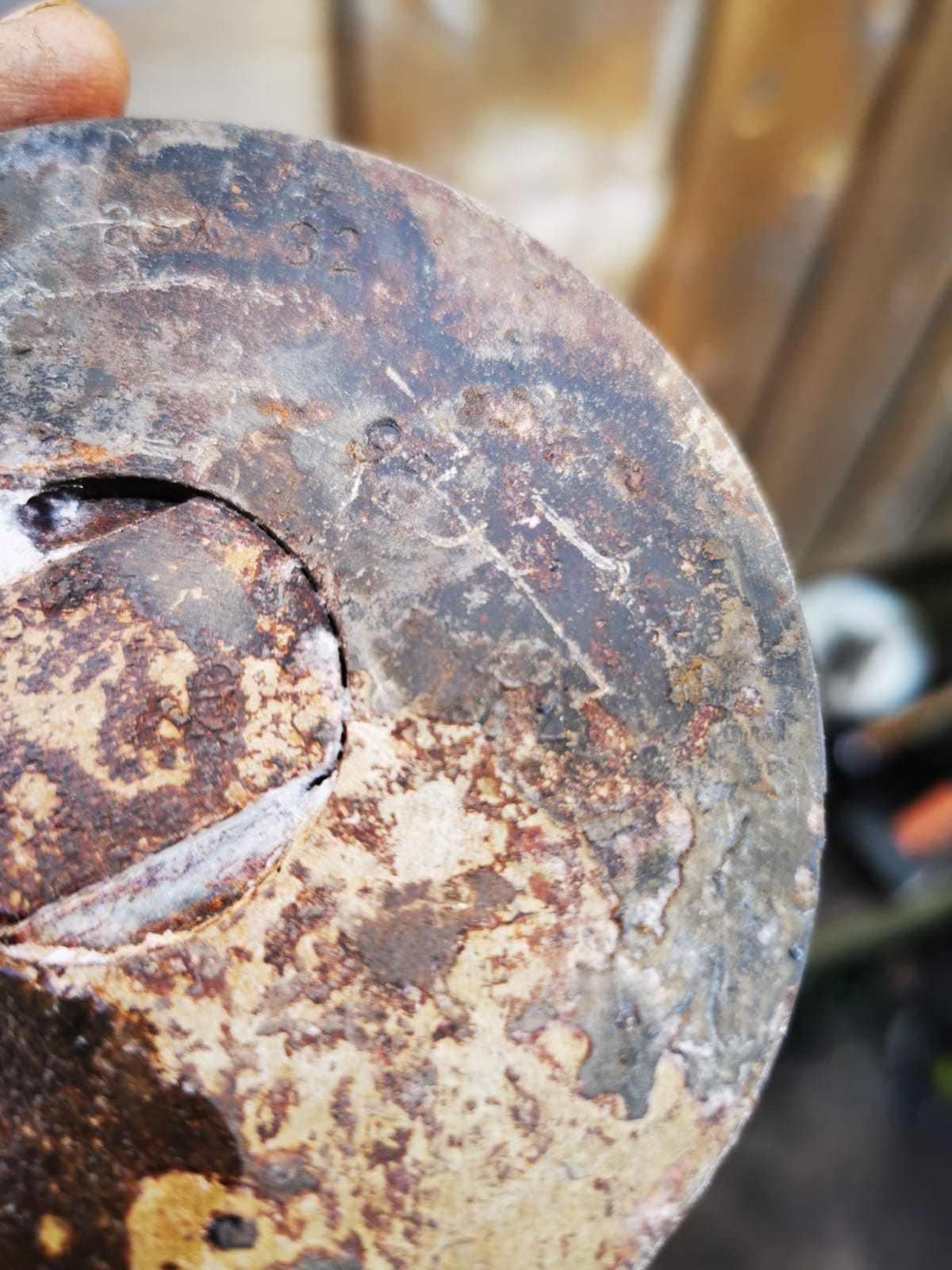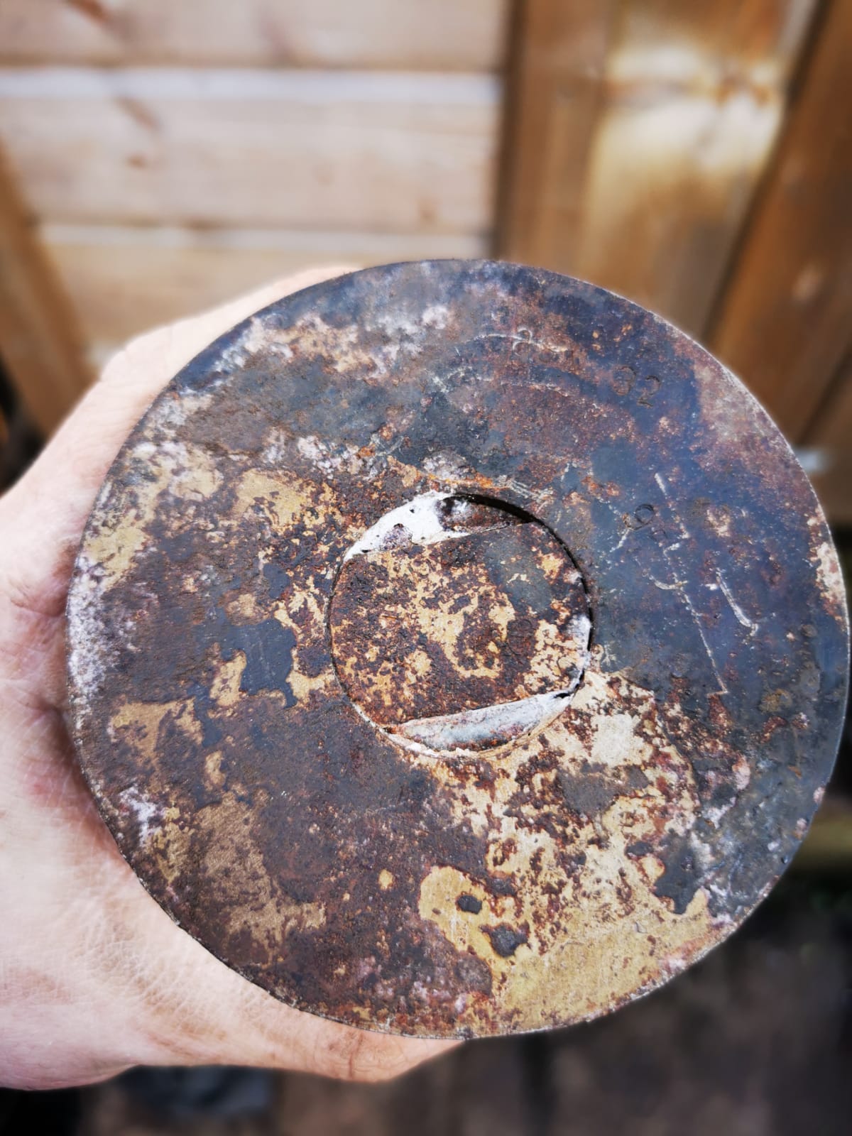 shell is in mint relic condition few small holes, but in full original brass wash and late war paint,